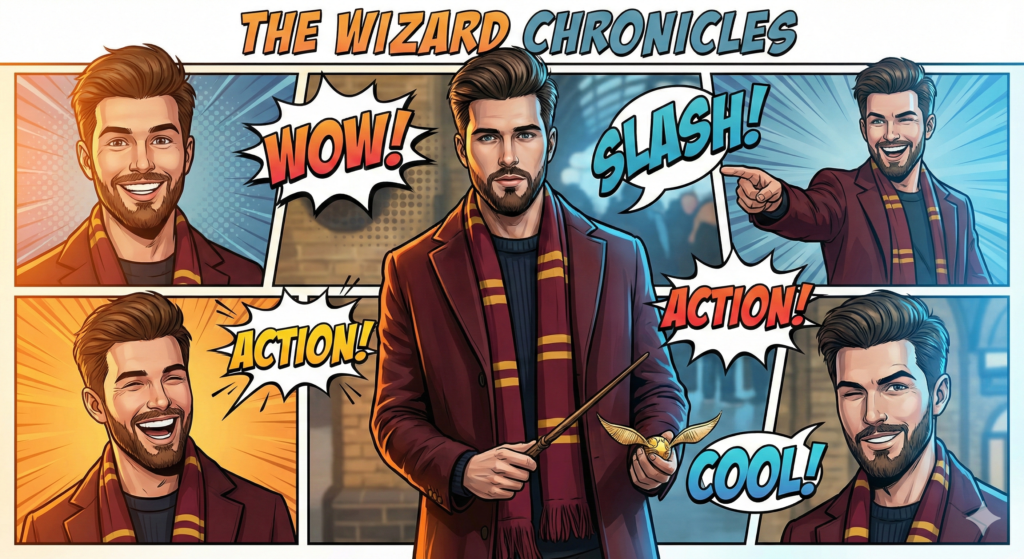 The background features stylized comic panels arranged like a superhero cover — each showing the same person in mini poses (smiling, pointing, laughing, winking).